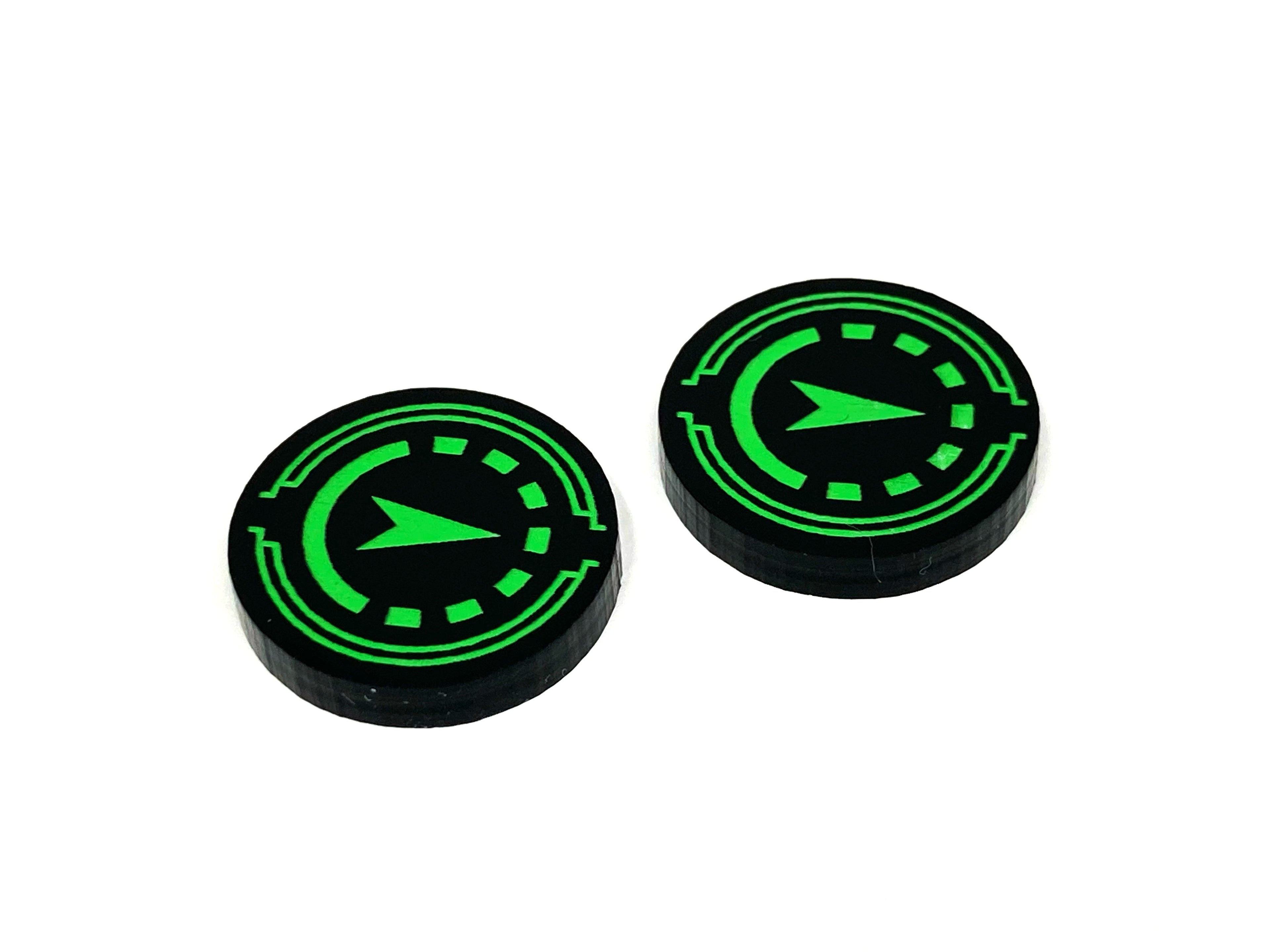 - 2 x Reinforce tokens, laser etched on both sides, cut from 3mm opaque black acrylic and painted green on both sides. Measuring 19mm in diameter.